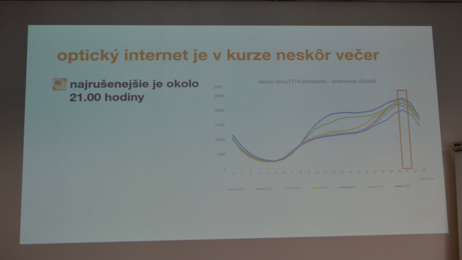 Nikoho zrejme neprekvapí, že najviac dát "tečie" cez optický internet okolo deviatej hodiny večer. V priebehu dňa postupne počet pripojených zákazníko rastie, kulminuje večer a s príchodom polnoci postupne klesá.