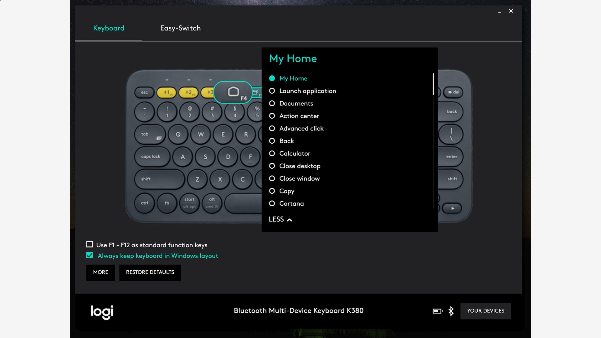 Logitech dodáva softvér na úpravu funkcií a monitorovanie klávesníc. K810, ktorá vyšla už dávnejšie, používa aplikáciu SetPoint, K380 novšiu - Logitech Options. Obe aplikácie umožňujú zmeniť správanie F-klávesov a pre niektoré z nich nastaviť vlastnú akciu. Logitech Options okrem moderného dizajnu združuje nastavenia všetkých nových produktov a pokiaľ používate viacero zariadení tejto značky, nájdete ich tak na jednom mieste.