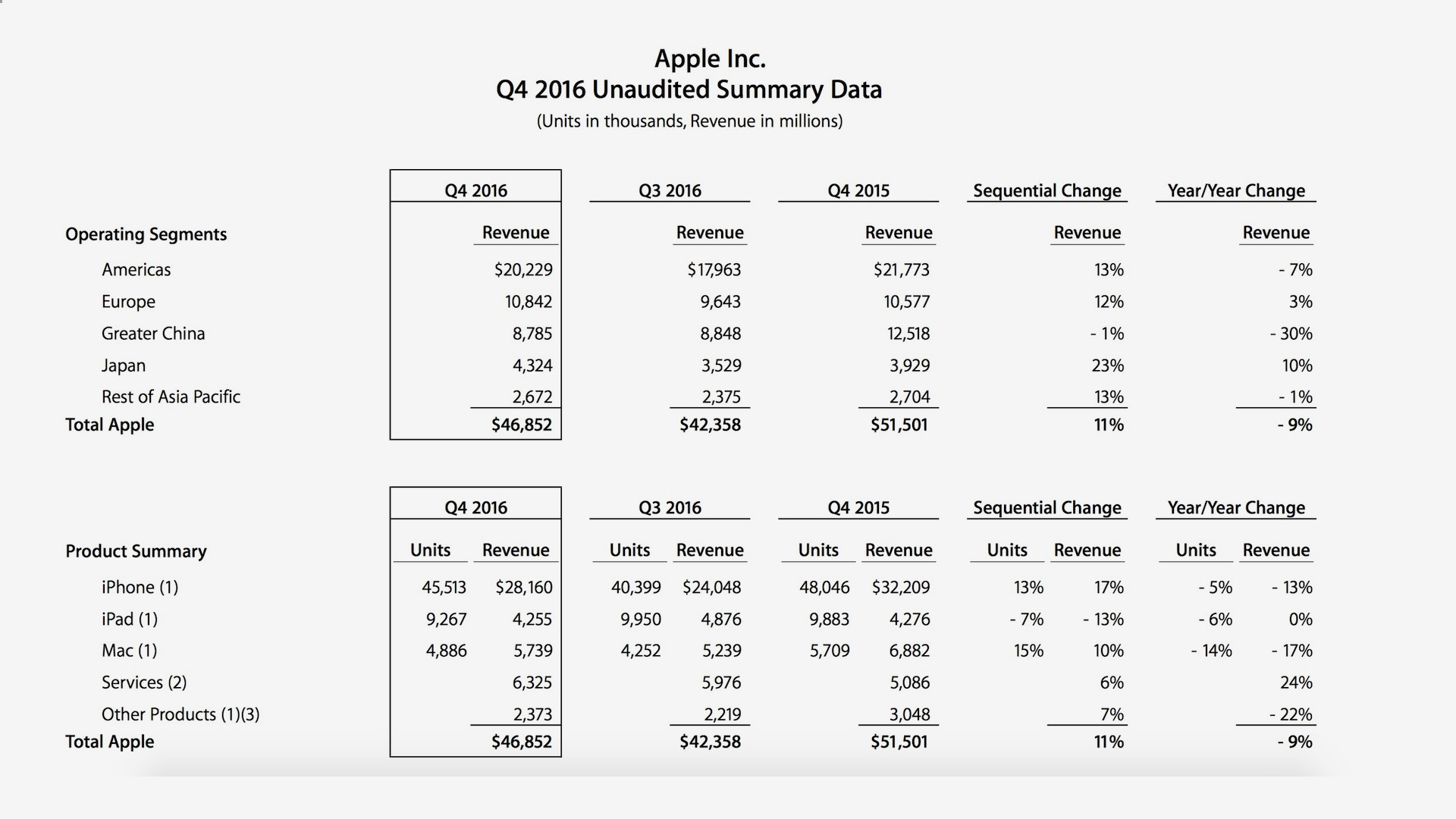 Tržby za Q3 2016 vykázal Apple vo výške 46,852 miliárd amerických dolárov, čo je 9 % pokles oproti rovnakému obdobiu minulého roka. Pri porovnaní s predchádzajúcim štvrťrokom sa naopak celkové tržby o 11 % zvýšili. Najväčší pokles zaznamenali predaje na čínskom trhu. Čistý zisk bol na úrovni 9 mld. dolárov (o dve miliardy menej než pred rokom), čo predstavuje 1,67 dolára na jednu akciu. Medzinárodné predaje predstavovali 62 % štvrťročných príjmov, hrubá marža medziročne klesla z 39,9 % na 38 %.