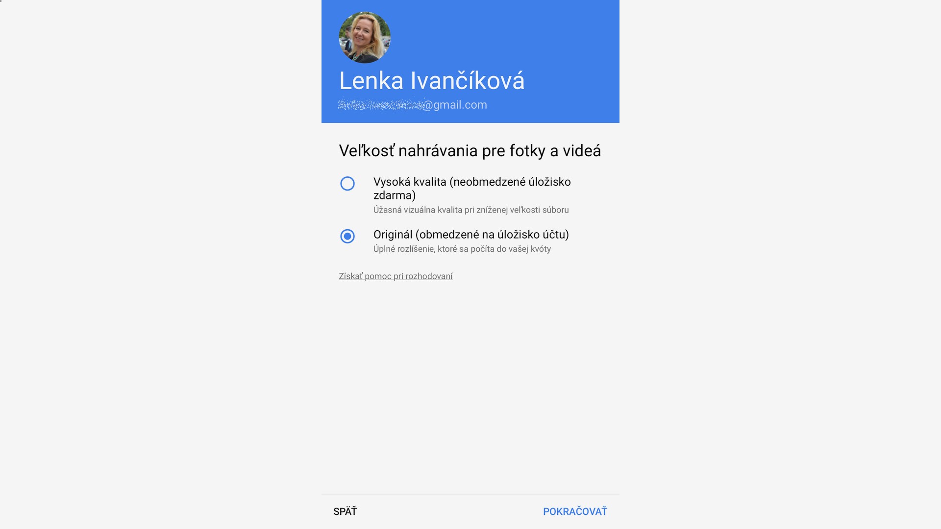Aplikácia Google Fotky zálohuje vaše fotografie a videá do cloudu a kedykoľvek k nim máte prístup buď z mobilného zariadenia s operačným systémom Android, iOS alebo počítača. Aplikáciu môžete používať iba s Gmail kontom. Po zadaní prihlasovacích údajov si vyberiete, v akej kvalite sa budú fotografie a videá zálohovať.