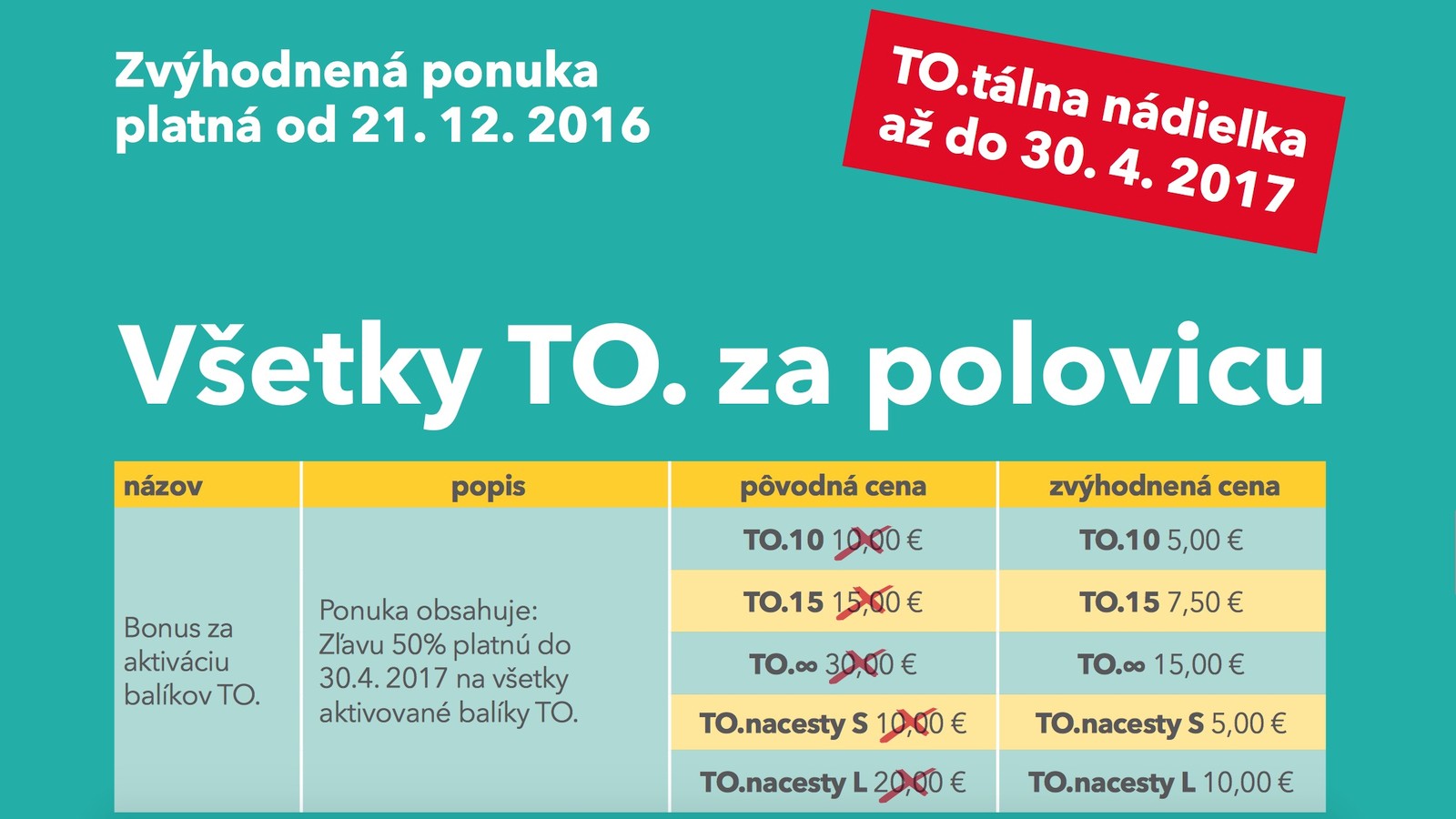 TO. su Vianoce! Odteraz uplne pre vsetkych aj bez prenosu cisla! Vsetky aktivovane TO. do konca aprila 2017 len za polovicu ceny. Zdravie, stastie, gigabajtov plna casa, vinsuje Vam 4ka Vasa.