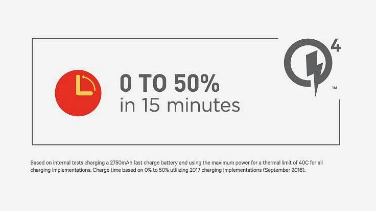 Podľa Qualcommu je funkcia rýchleho nabíjania jedným z rozhodujúcich faktorov pri kúpe nového smartfónu. A práve Quick Charge 4.0 bude veľkým ťahákom nového čipsetu. Na nabitie 50 % kapacity batérie by malo stačiť len 15 minút a päťminútové nabíjanie umožní až päťhodín hovoru (testované na 2750 mAh batérii).