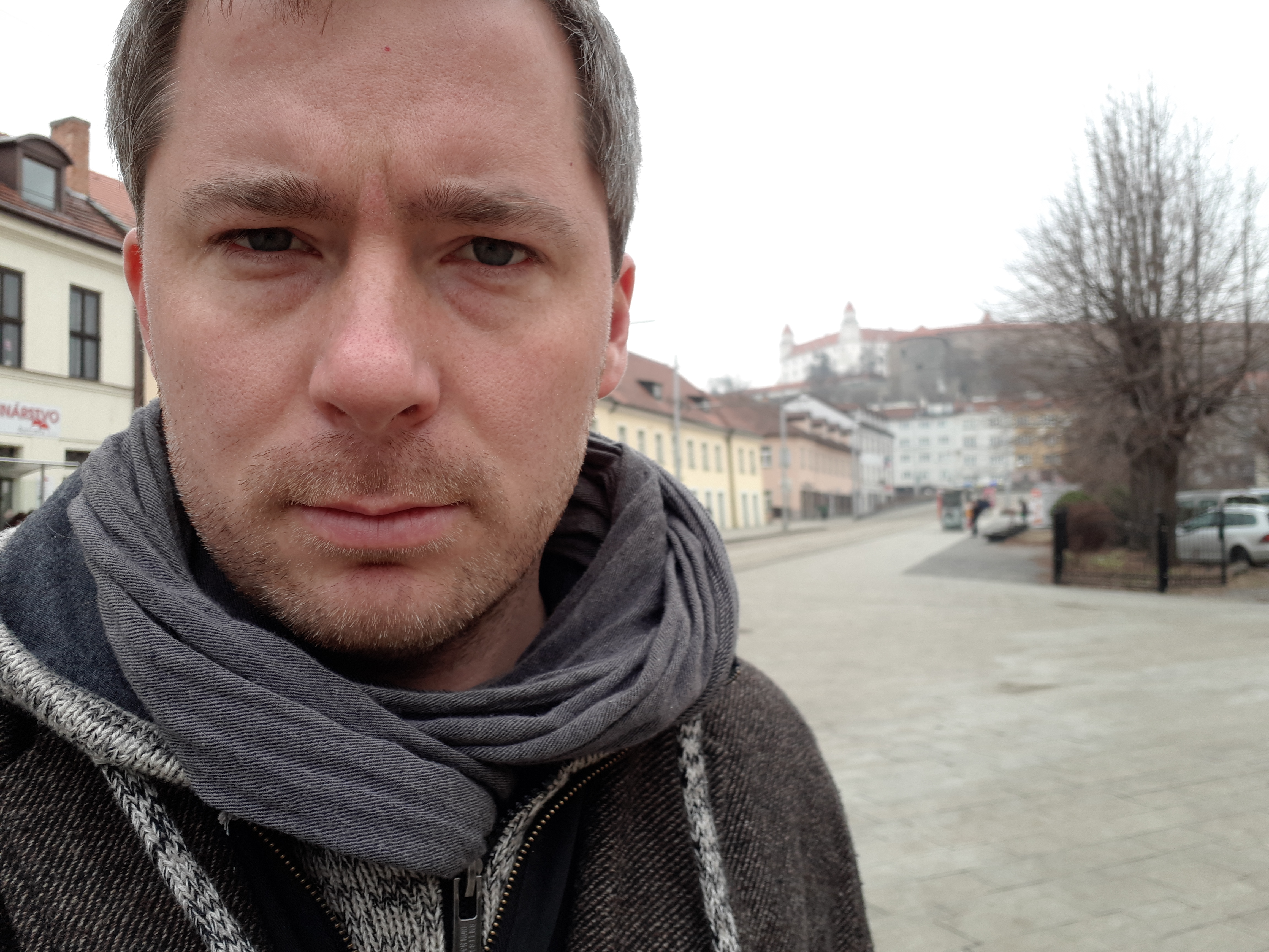 Veľkým lákadlom je predný fotoaparát. 16 Mpix (resp. 12 Mpix s pomerom strán 16:9) je výnimočných. Škoda, že predná kamera nezaostruje. Mimochodom, ako vidíte na testovacích snímkach aj videu, je zaostrená na mimoriadne blízku vzdialenosť. Pozadie je tak efektne rozmazané, ale keď natiahnem ruku, už som rozmazaný aj ja.
