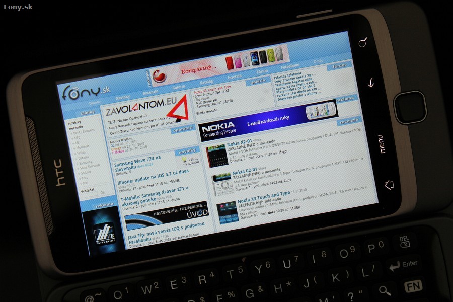 . Nový mechanizmus otvárania umožňuje jednoduché vysúvanie, ktoré zvládnete i jedným prstom. Mechanizmus totiž vôbec nekladie odpor. Toto však môže byť v určitých situáciách i nevýhodou. Spomeniem napríklad moment, kedy ležíte v posteli, pozeráte film či SMS-kujete a nad hlavou držíte Desire Z. Vtedy je telefón náchylný k spätnému zasunutiu displeja. Stačí pritom malý pohyb rukou a horná časť sa zaklopí. Samotná klávesnica je však spracovaná dobre a písanie na nej je pohodlné. Klávesnica je štvorriadková a obsahuje celkovo až 43 tlačidiel. Podsvietenie je biele a nie príliš silné, takže písanie vás nebude rušiť ani v úplnej tme. Oceňujem prítomnosť tlačidiel Shift a Fn po oboch stranách klávesnice, chýbal mi iba samostatný riadok s číslami. Novinkou sú aj dve programovateľné klávesy v pravom dolnom rohu, ktorým môžete priradiť spustenie akejkoľvek aplikácie či skratky. Pri písaní sa nedajte zmýliť ikonou "En" v pravom rohu displeja. Ak chcete zadať slovenské znaky, ako napríklad "č", stačí podržať tlačidlo s písmenom C a vyskočí panel s rôznymi obmenami znaku.Kapacitný Super LCD
