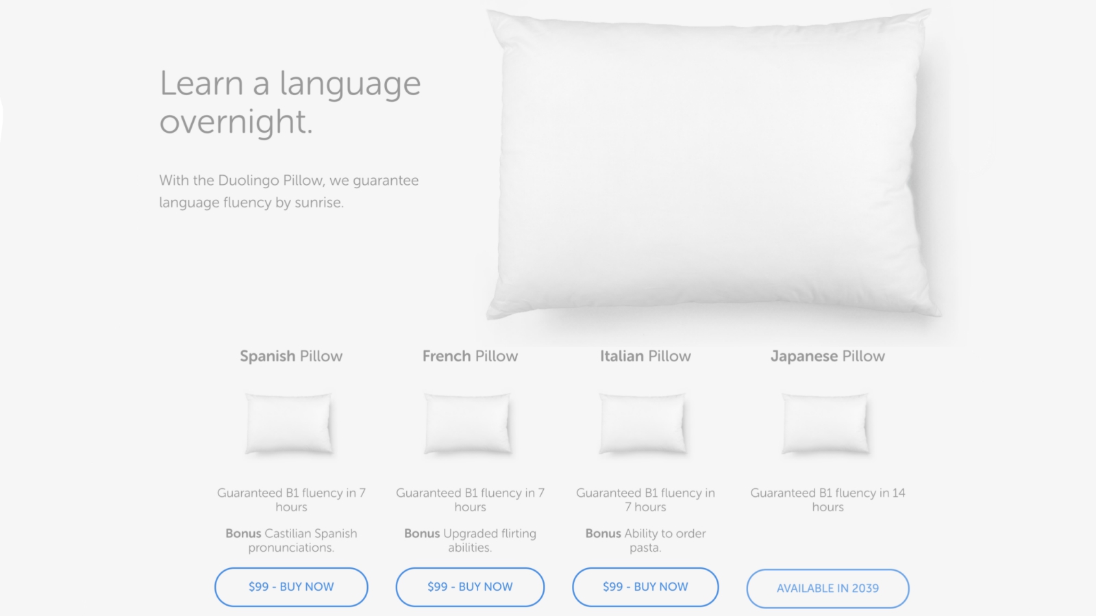 Duolingo vlani ponúkalo špeciálne vankúše za 99 dolárov. Mali vysielať vysokofrekvenčné zvuky a vyťukávať kód v Morseovej abecede. Kombinácia sľubovala naučenie správnej výslovnosť a základnej slovnej zásoby v španielčine, taliančine a francúzštine už za 7 hodín spánku na nich.