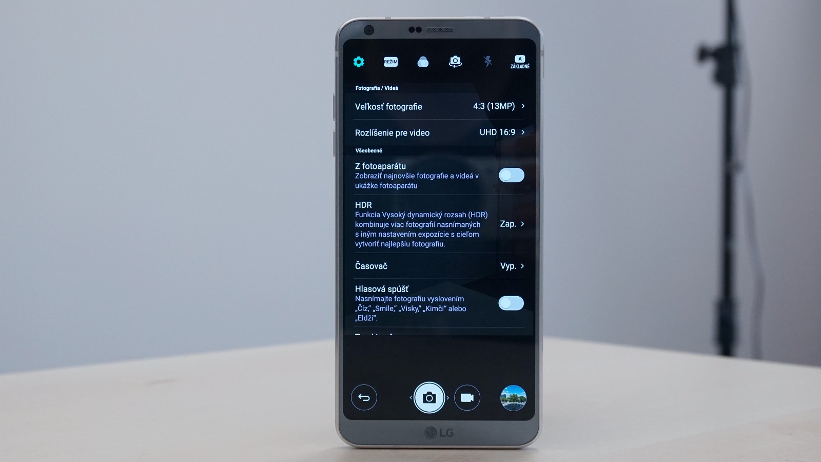 Základný ponúka asi 29 mm ohniskovú vzdialenosť po prepočte na kinofilm. Nechýba detailný manuálny režim, príjemným prekvapením je manuálny režim záznamu videa (Full HD s viacerými pomermi strán od 16:9 až po 21:9, 30 / 60 fps alebo 4K). Po dotyku obrazovky a označení objektu, na ktorý má G6 zaostriť, máte možnosť doladiť expozíciu. Aj pri zázname videa. HDR žiaľ zapínate v nastaveniach - raz a navždy. Pri pohyblivých objektoch to nemusí byť úplná výhoda a radšej mám prepínač HDR v ľavej bočnej lište.