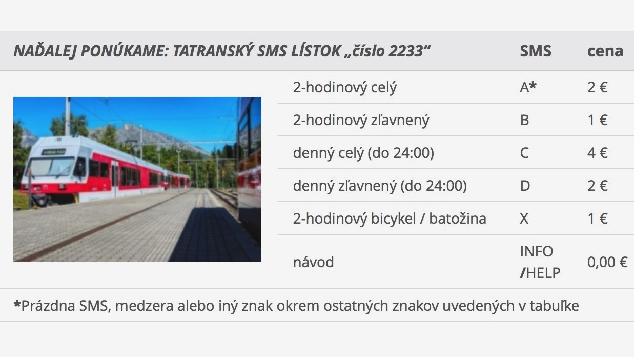 - 60-minútový lístok za 2,50 €, odoslať SMS v tvare A