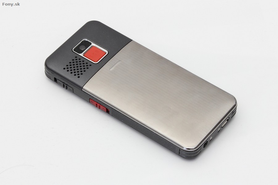 Zadná stena prístroja obsahuje objektív jednoduchého fotoaparátu a už typické SOS tlačidlo. Je trochu menšie a zapustené, čo bráni zbytočným omylom. Pod batériou sa nachádza nielen slot pre SIM kartu, ale aj microSD.