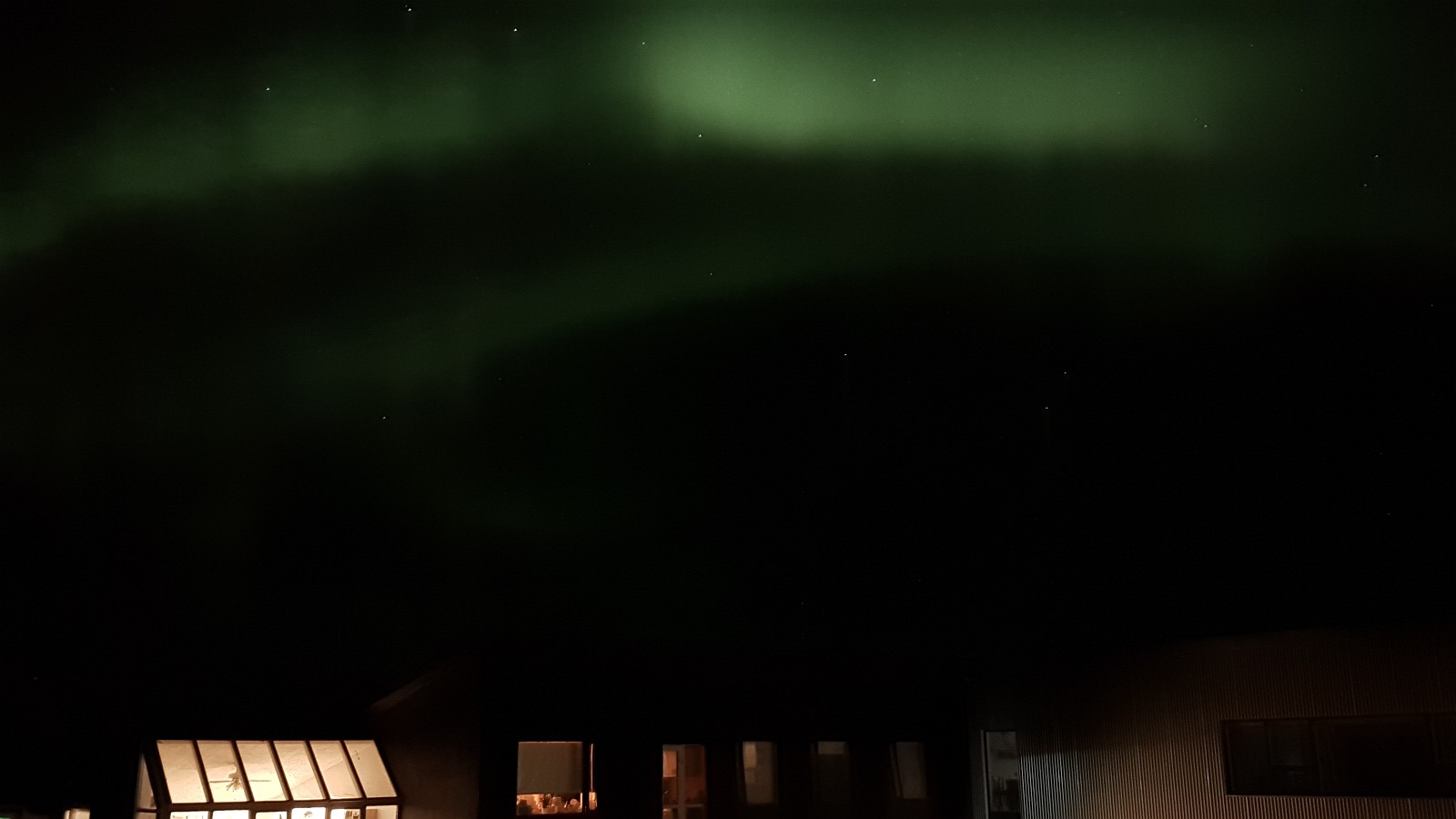 Polárna žiara z hotela Laki pôsobila, akoby kopce niekto z druhej strany nasvietil pohybujúcimi sa zelenými reflektormi.
