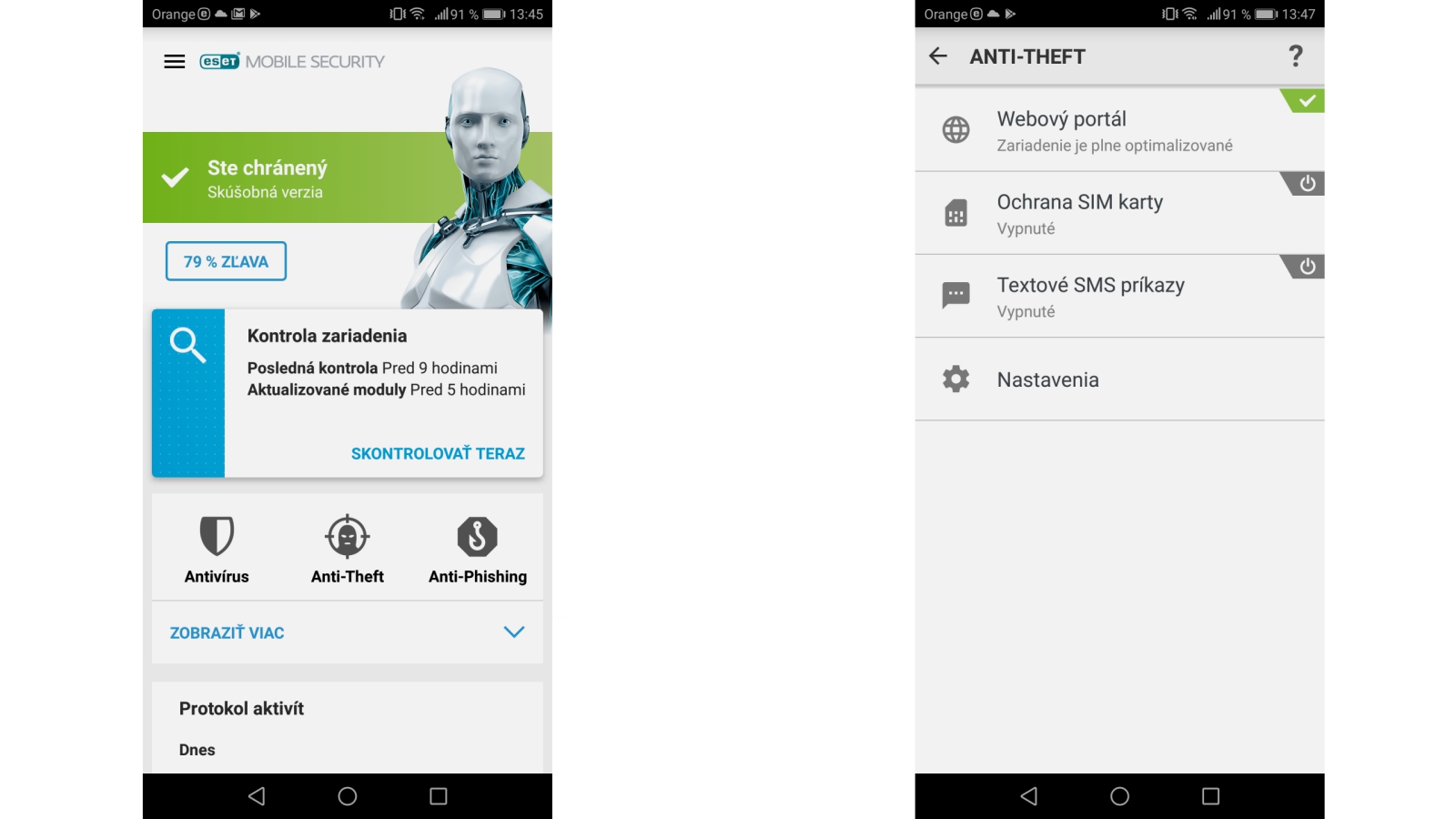 Anti-Theft má v aplikácii ESET Mobile Security vyhradenú samostatnú položku chránenú špeciálnym heslom alebo odtlačkom prsta. To hlavne preto, aby ju útočník, hoci s prístupom na domácu obrazovku telefónu, nemohol vypnúť.