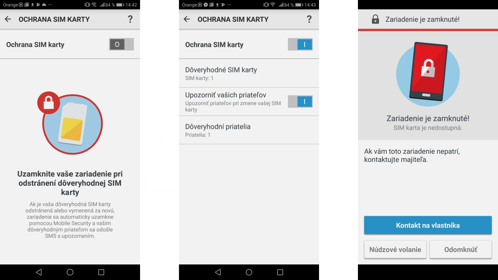 Ak ju zapnete, telefón sa zablokuje okamžite po vybratí spárovanej SIM karty. Navyše, ak sa zlodej pokúsi vložiť inú, ESET z nej odošle SMS upozornenie na vami zvolené telefónne číslo.