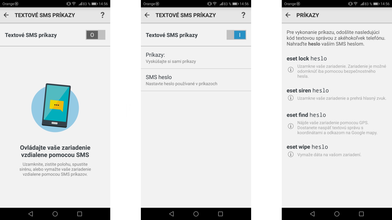 Ak v telefóne zostane vaša SIM, nainštalovaný ESET Mobile Security budete môcť ovládať aj cez Textové SMS príkazy odosielané z iného mobilu. Opäť najmä v prípade, že to k pohodlnejšiemu internetovému rozhraniu máte ďaleko. Zvolíte si ľubovoľné heslo, ktoré potom odošlete v SMS správach za príkazmi eset lock, siren, find alebo wipe.