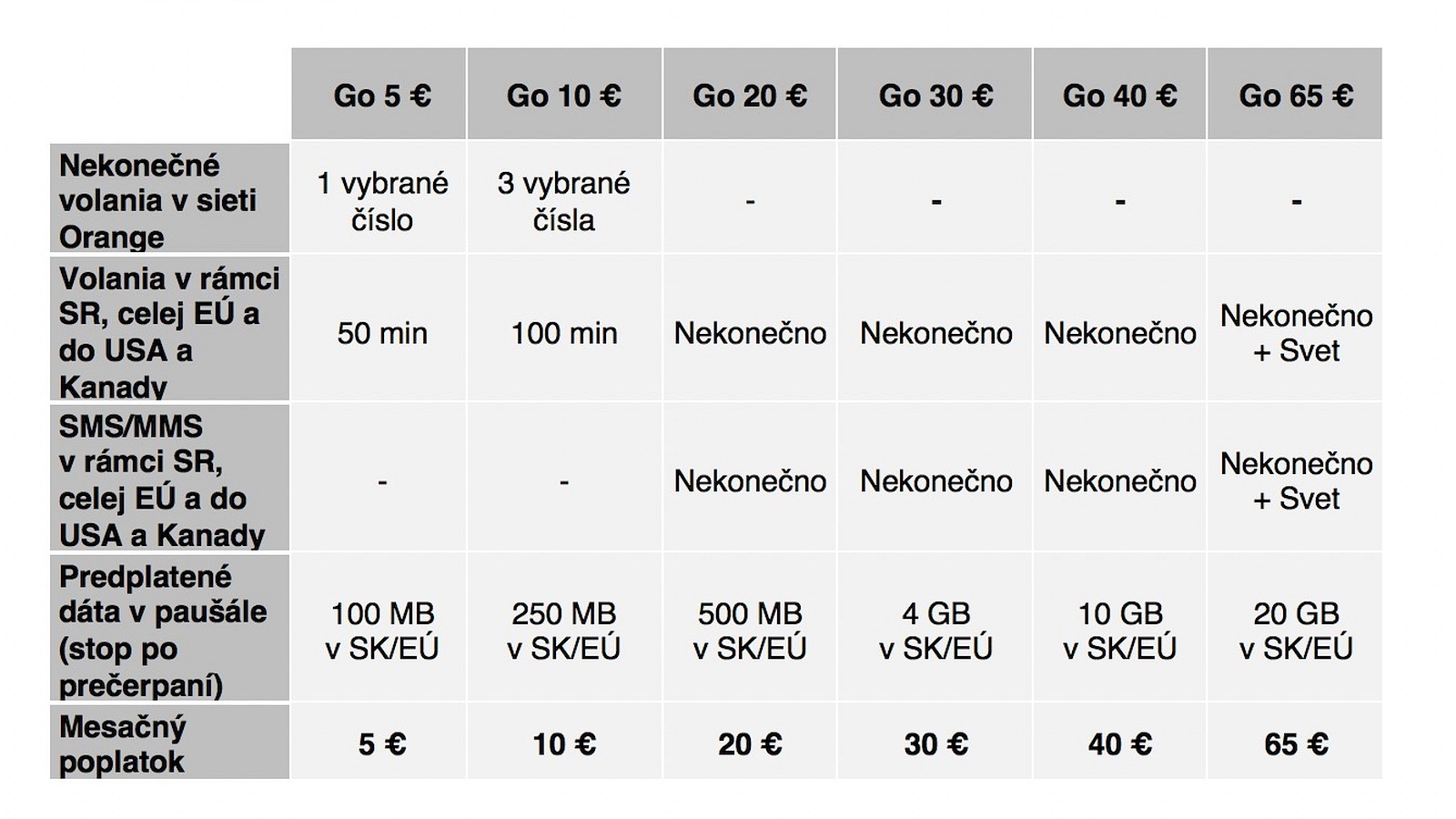 Vynovené portfólio paušálov sa volá jednoducho Go (zmizlo slovo Europe) a obsahuje šesť programov. Neobmedzené volania a správy do všetkých sietí sú teraz k dispozícii už od 20 eur mesačne a skupinu Navzájom zadarmo je možné vytvoriť už pri mesačnom poplatku 15 eur. S novými paušálmi Go navyše získate väčšiu porciu dát, a to až do 20 GB.