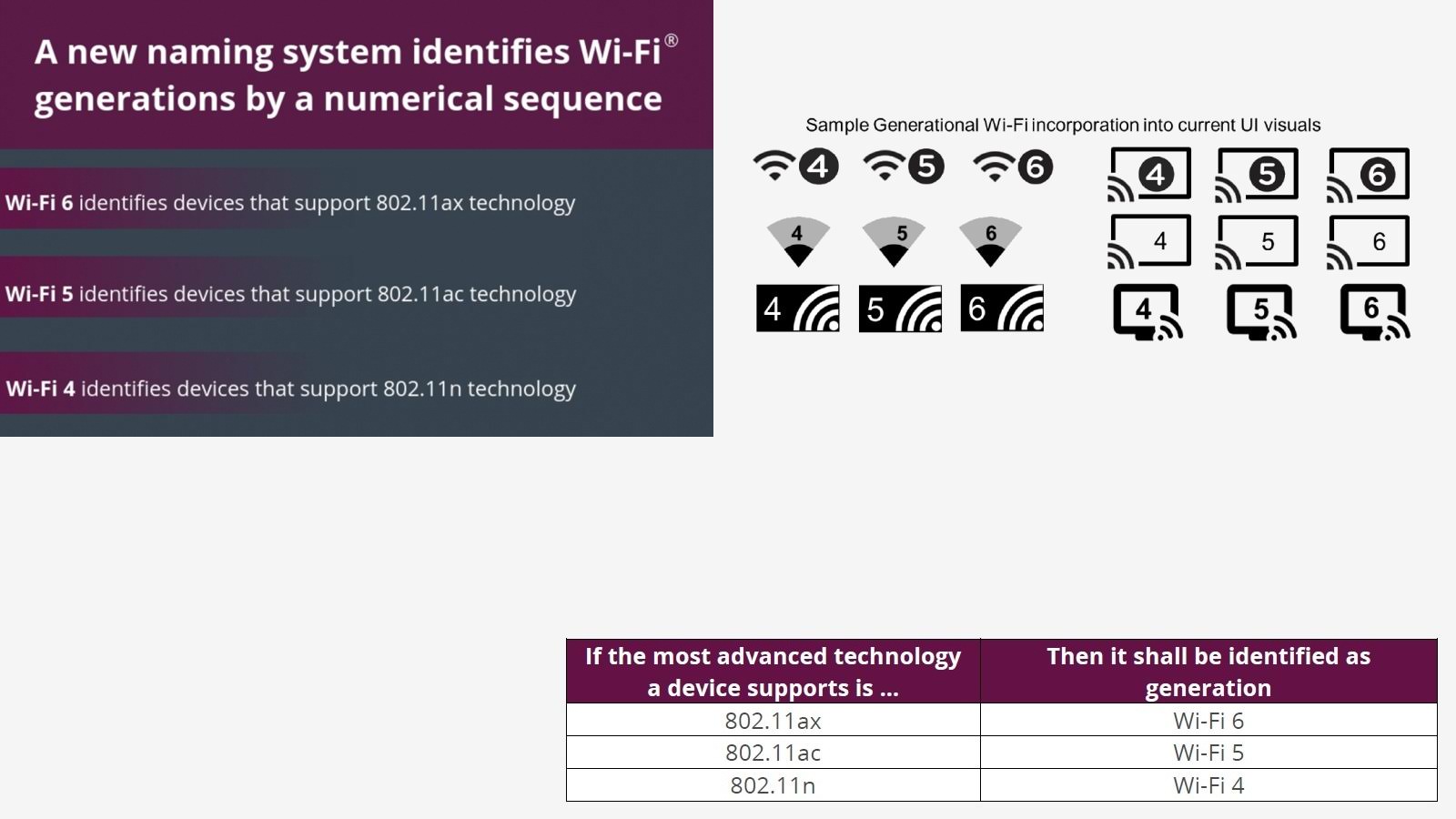 Upravené boli aj názvy predchádzajúcich generácii 802.11ac (Wi-Fi 5) a 802.11n (Wi-Fi 4). Nové označenie tak má pomôcť spotrebiteľom lepšie pochopiť rozdiely, kde vyššie číslo bude automaticky znamenať lepšie pripojenie.