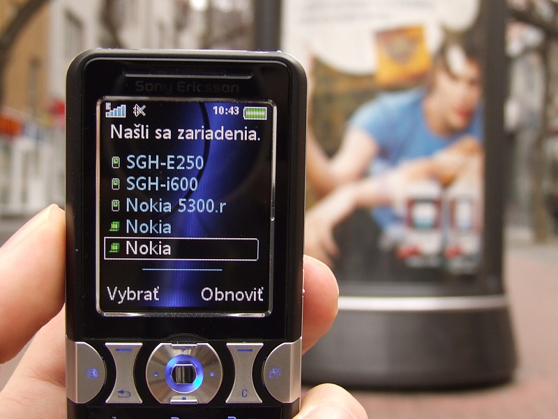 Ako tak idem po Bratislave a naraz sa vo všetkých mojich telefónoch objaví otázka, či chcem stiahnuť súbor Nokia.mp3. Používam totiž vždy Bluetooth v zaputom a viditeľnom režime. Ak by som nevedel, o čo ide, asi by som odmietol. Jedine mobil s Windows Mobile začal skladbu sťahovať okamžite, mohol som však príjem prerušiť alebo na konci uložiť alebo zrušiť. Ale nie, takto mám v telefóne súbor Nokia.mp3 so skladbou od Support Lesbiens s dátovým tokom 24 kbps. Na počúvanie priamo z mobilu ešte obstojné, na zneužitie služby absolútne nepoužiteľné. Zámer je teda splnený. Skladbu Nokia.mp3 mi do mobilu poslal špeciálny citylight, hudobná vitrína.
