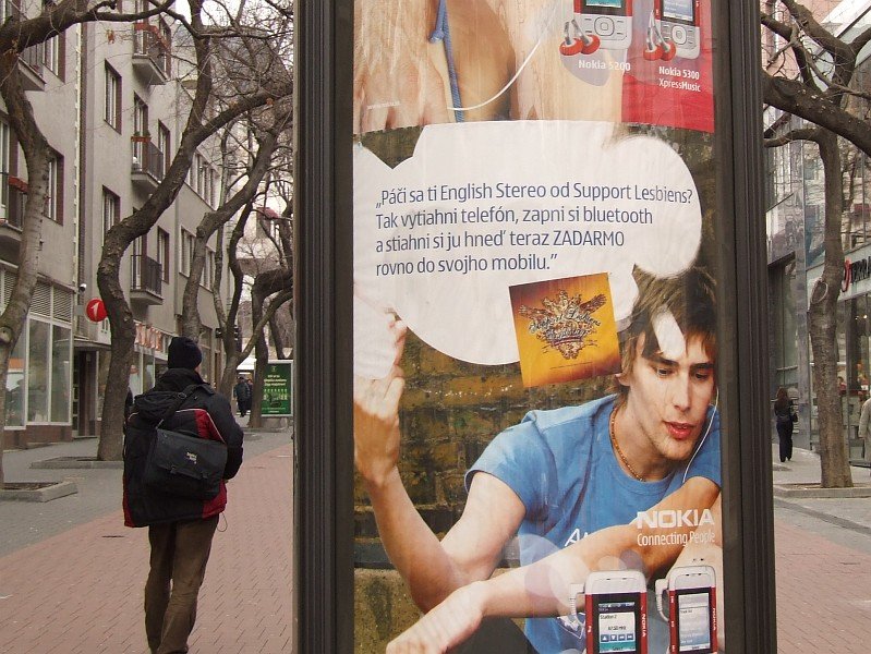 Bratislava, 1. marca 2007 – Spoločnosť Nokia prináša na Slovensko novinku v reklame: všetci, ktorí od 20. februára do 5. marca pôjdu v Bratislave okolo hrajúcich citylight vitrín, nachádzajúcich sa Poštovej ulici, Kamennom námestí, Hodžovom námestí, Zochovej ulici a Šafárikovom námestí, si môžu do mobilného telefónu legálne stiahnuť pieseň skupiny Support Lesbiens „English Stereo“. V priebehu prvého týždňa od spustenia akcie si pieseň stiahlo vyše 5100 ľudí.