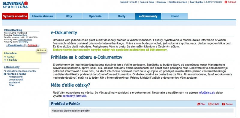 Klienti Slovenskej sporiteľne si odteraz môžu v internetbankingu zriadiť novú službu Zasielanie elektronických dokumentov (e-dokumenty) od spoločnosti Orange. Využiť ju môžu iba zákazníci, ktorí sú súčasne klientmi Slovenskej sporiteľne a spoločnosti Orange. Ten je pri službe e-dokumenty prvým partnerom banky, v budúcnosti by mali pribudnúť ďalší.