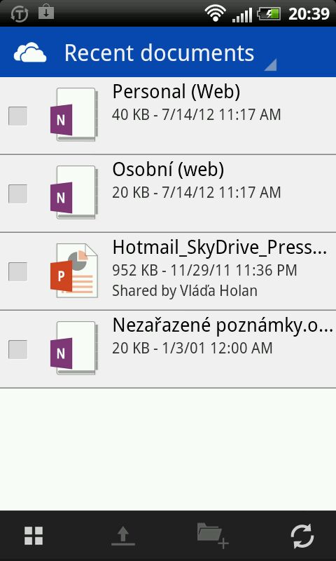 Nechýba možnosť zobraziť naposledy použité alebo zdieľané dokumenty, označiť súbory, ktoré chcete odoslať či spravovať uložený obsah - mazať a vytvárať nové priečinky. Ku SkyDrive sa dá pristupovať aj cez iné Android aplikácie.
