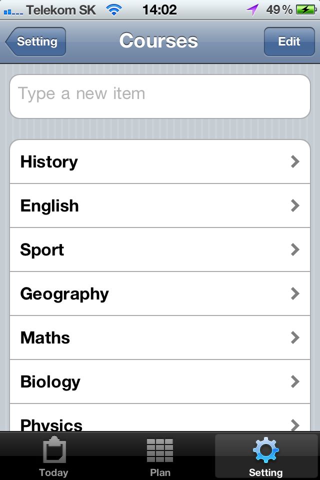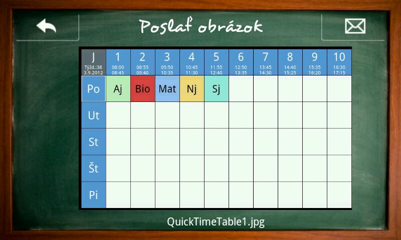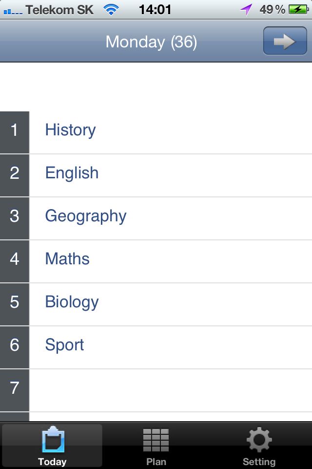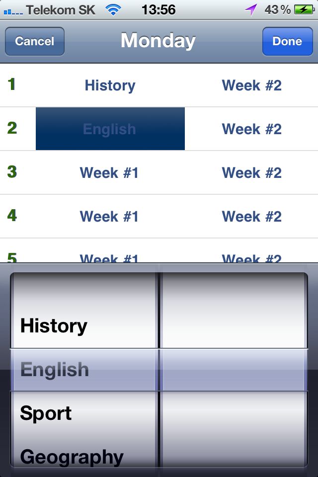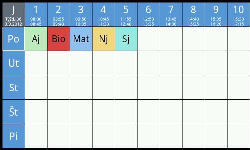 Používateľ si môže vytvárať a premenovávať jednotlivé predmety, maximálny počet vyučovacích hodín denne nie je pevne daný. V prehľade však chýba zobrazenie času, dozvieme sa iba deň, názov a poradie. nechýba možnosť vytvoriť osobitný rozvrh pre párny a nepárny týždeň. Lokalizácia je iba v anglickom a čínskom jazyku. Farebnosť a podrobnejšie úpravy, zálohovanie a zdieľanie rozvrhu chýba úplne.