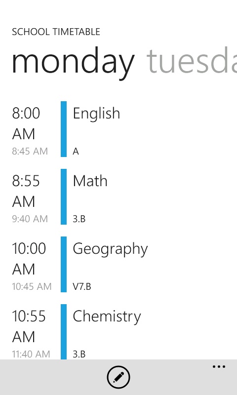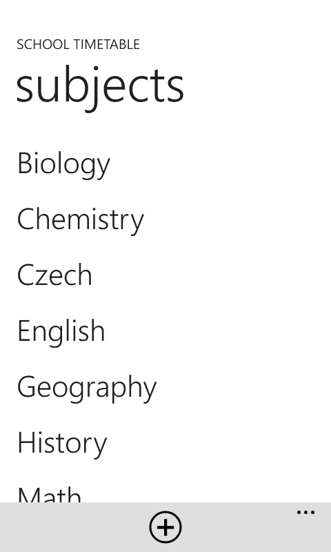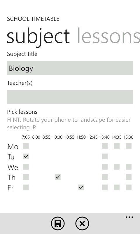 Pre operačný systém Windows Phone nájdeme aplikáciu v češtine a angličtine od českého vývojára s názvom School Timetable. Pri prvom spustení si nastavíte základné údaje: dĺžku hodiny, ich počet v stĺpci aj začiatok vyučovania. Pre každý deň v týždni si vytvoríte jednotlivé predmety s možnosťou pridať meno vyučujúceho učiteľa a zaznačíte si ich do zobrazeného rozvrhu.