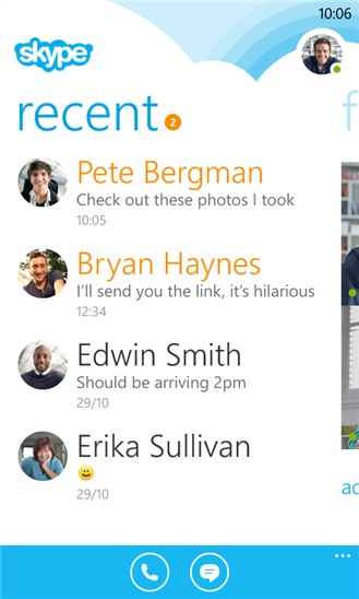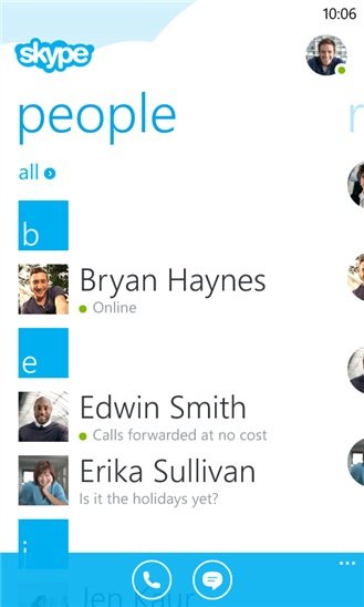 Beta verziu Skype (vyžaduje minimálne 512 MB RAM) si bezplatne stiahnete do svojich zariadení s OS Windows Phone 8 zo stránky www.windowsphone.com. Pre kvalitný prenos hlasu a obrazu odporúčame používať Wi-Fi pripojenie alebo 3G sieť mobilného operátora. Keďže ide o beta verziu, nemusí služba vždy fungovať korektne.
