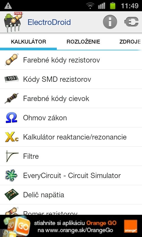 Hlavné menu aplikácie ElectroDroid je rozdelené do troch častí - kalkulátory, schémy rôznych káblov a konektorov a ďalšie informácie pomenované ako "zdroje“.