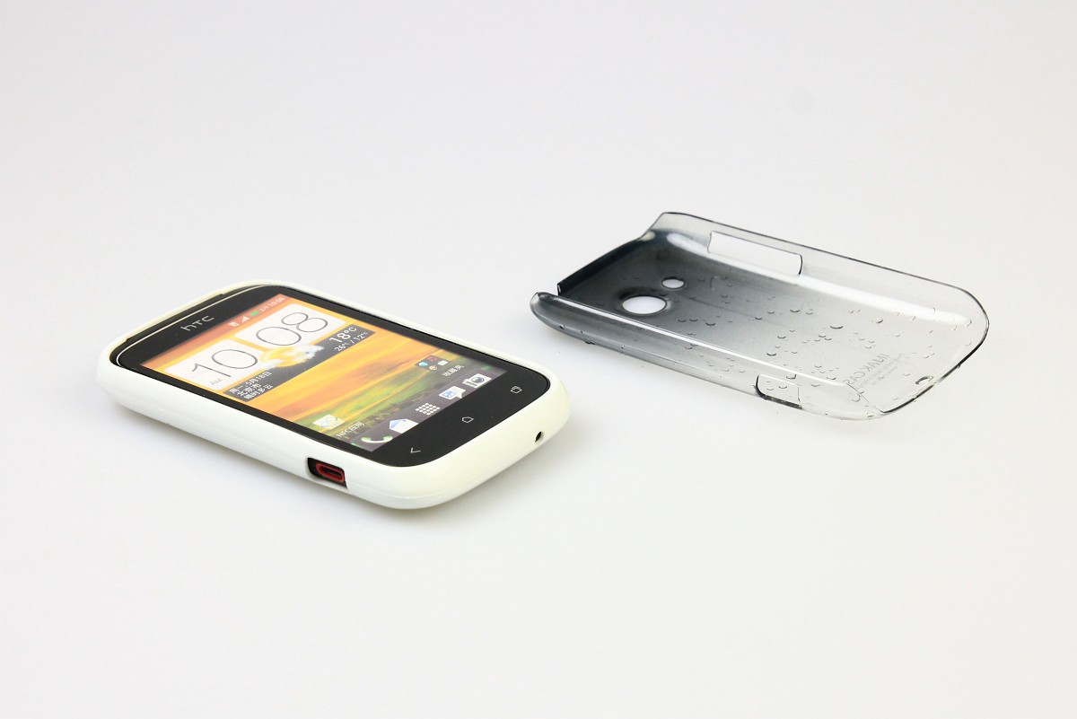 Biely kryt a plastový ochranný kryt s dažďovými kvapkami na HTC Desire C: