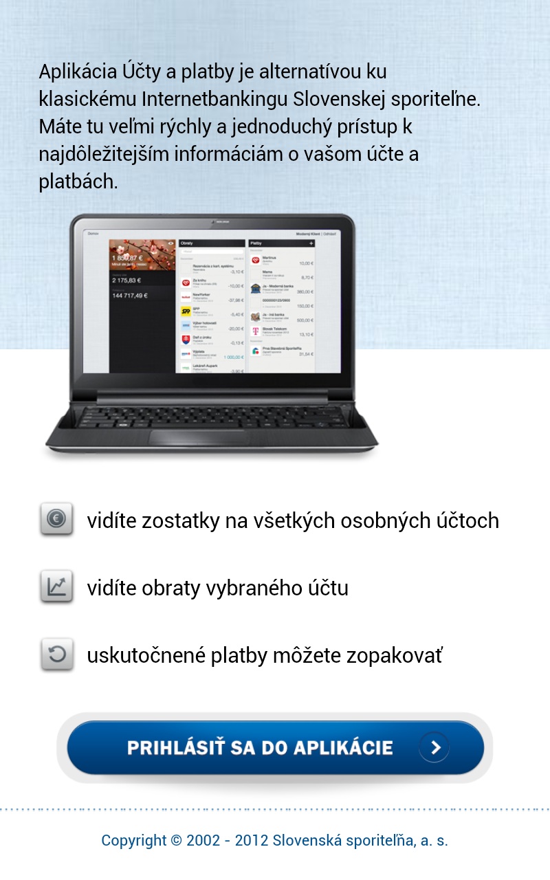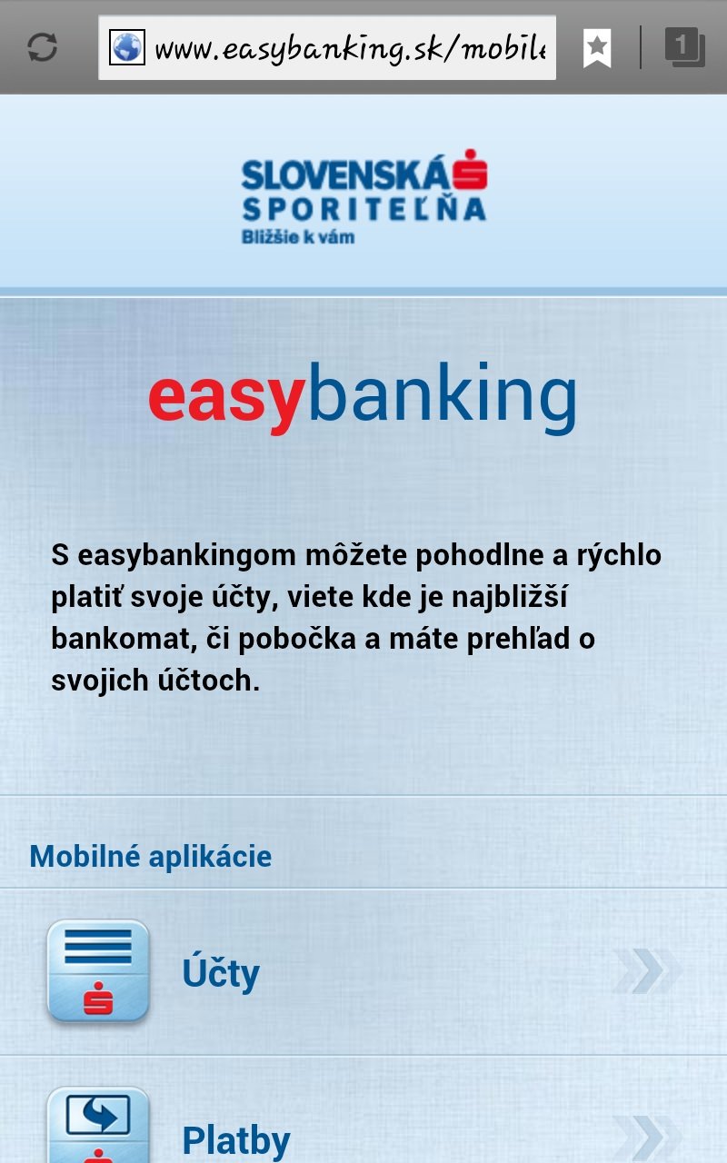 Po zadaní adresy www.easybanking.sk do adresného riadku webového prehliadača sa zákazníkom SLSP zobrazí prístup k mobilným a webovým aplikáciám na kontrolu a správu účtu. K mobilným aplikáciám Účty a Platby pribudla nová s názvom Lokátor, ktorá nájde najbližší bankomat či pobočku a umožní vyhľadať partnerské miesta Sphere, kde môžu zákazníci využiť zaujímavé zľavy.
