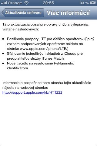 Nová verzia prináša, okrem opravy chýb a vylepšení stability, pre používateľov v USA možnosť zakúpiť si prostredníctvom hlasovej asistentky Siri lístky do kina. Na vybraných trhoch a u vybraných operátorov sa zákazníci dočkajú aj podpory LTE. Kompletný zoznam podporovaných krajín a operátorov nájdete na stránke www.apple.com/iphone/LTE.