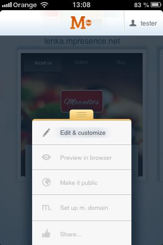 Aplikácia M.dot umožňuje vytvoriť si mobilnú webovú stránku priamo zo svojho smartfónu. Na výber máte z niekoľkých šablón. Vyberiete si tú, ktorá sa vám páči, pridáte meno a zapnete požadované funkcie na stránke.