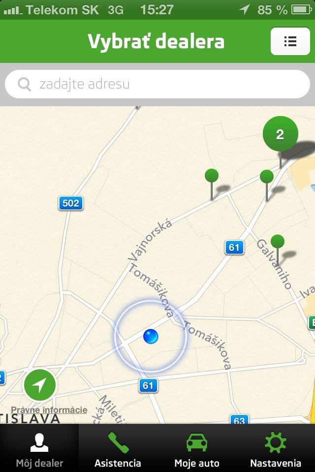 Podobným spôsobom funguje aj sekcia Asistencia, kde okrem zobrazenia najbližšieho servisného partnera nájdete možnosť rýchleho uskutočnenia hovoru na domáce a zahraničné číslo asistenčných služieb či praktický manuál, čo robiť v prípade nehody.