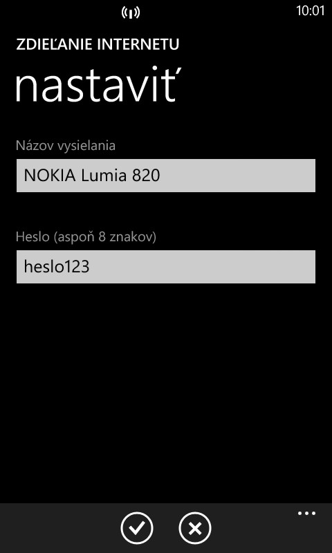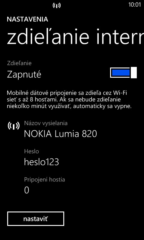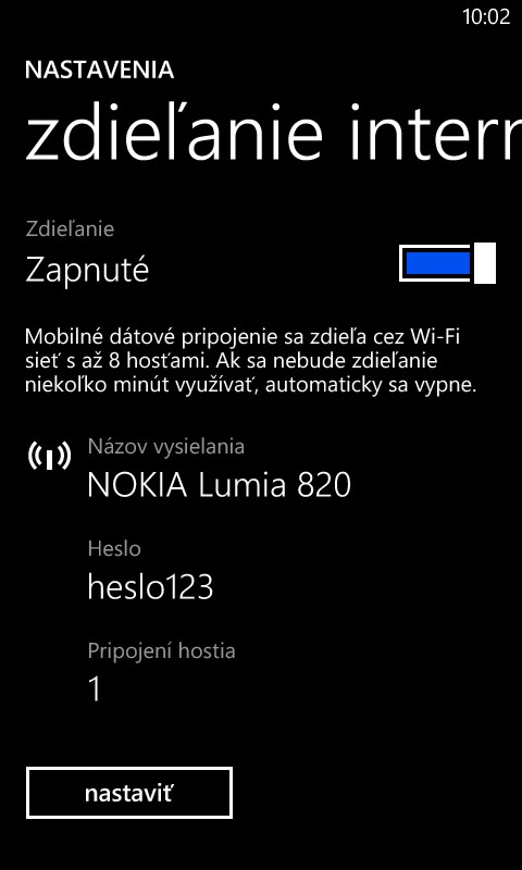 Ukáže sa pred vami názov pripojenia a heslo. Po kliknutí na položku Nastaviť môžete zmeniť názov a heslo pre váš osobný hotspot.