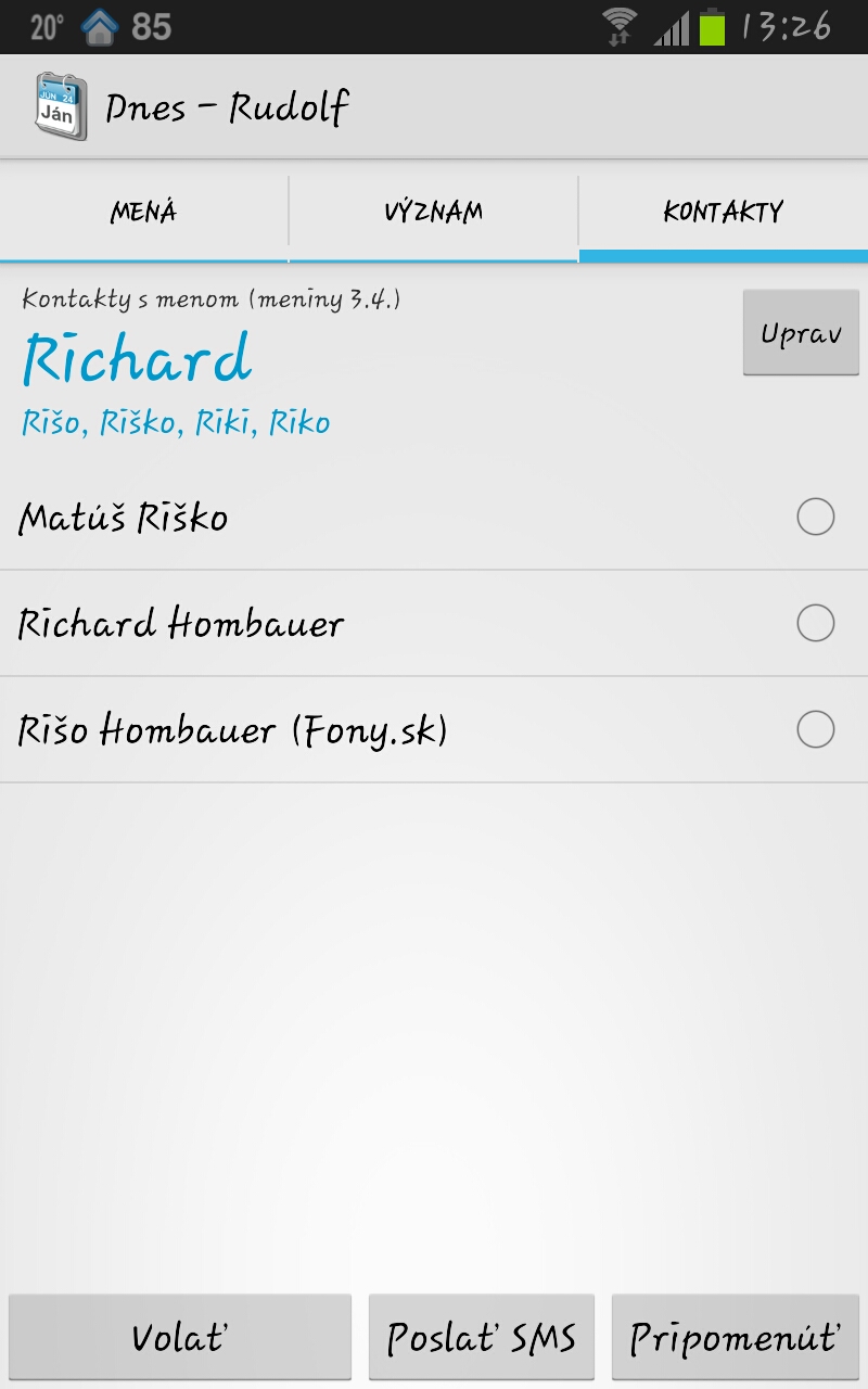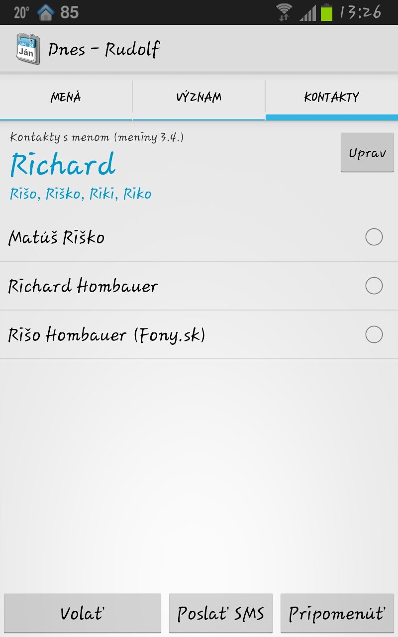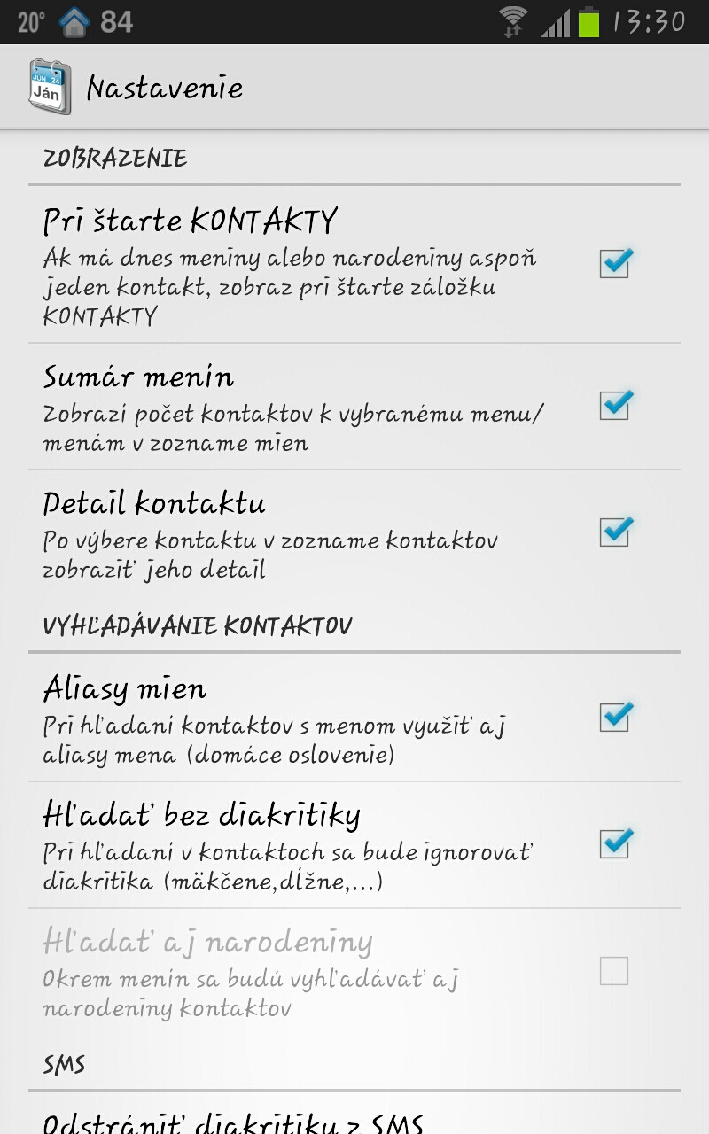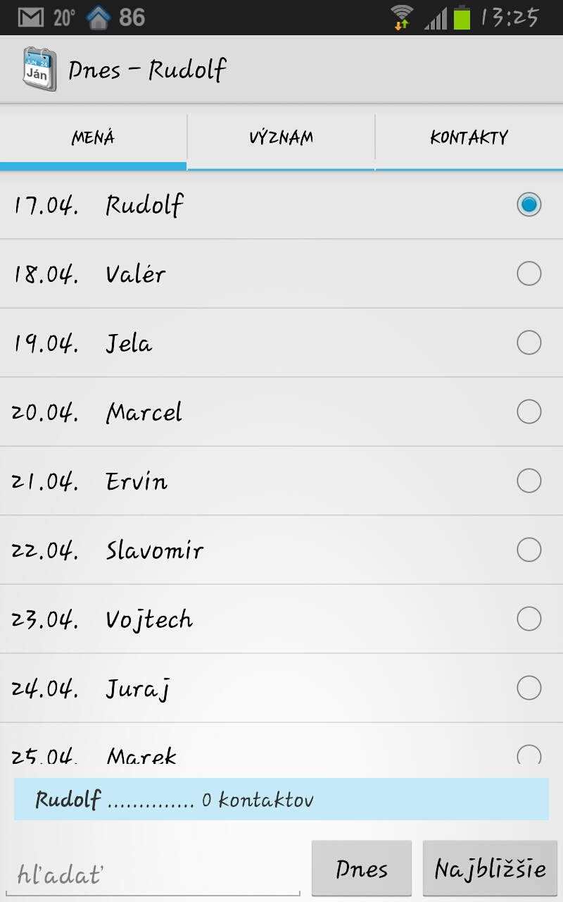 Okrem menín vás softvér upozorní aj na narodeniny, ak máte v adresári kontaktu uvedený dátum narodenia (Pro verzia). Zoznam mien, ktorý sa zobrazí po otvorení aplikácie, je usporiadaný podľa dátumu menín. K vybranému menu sa zobrazí počet kontaktov s daným menom alebo narodeninami pripadajúcimi na tento deň.