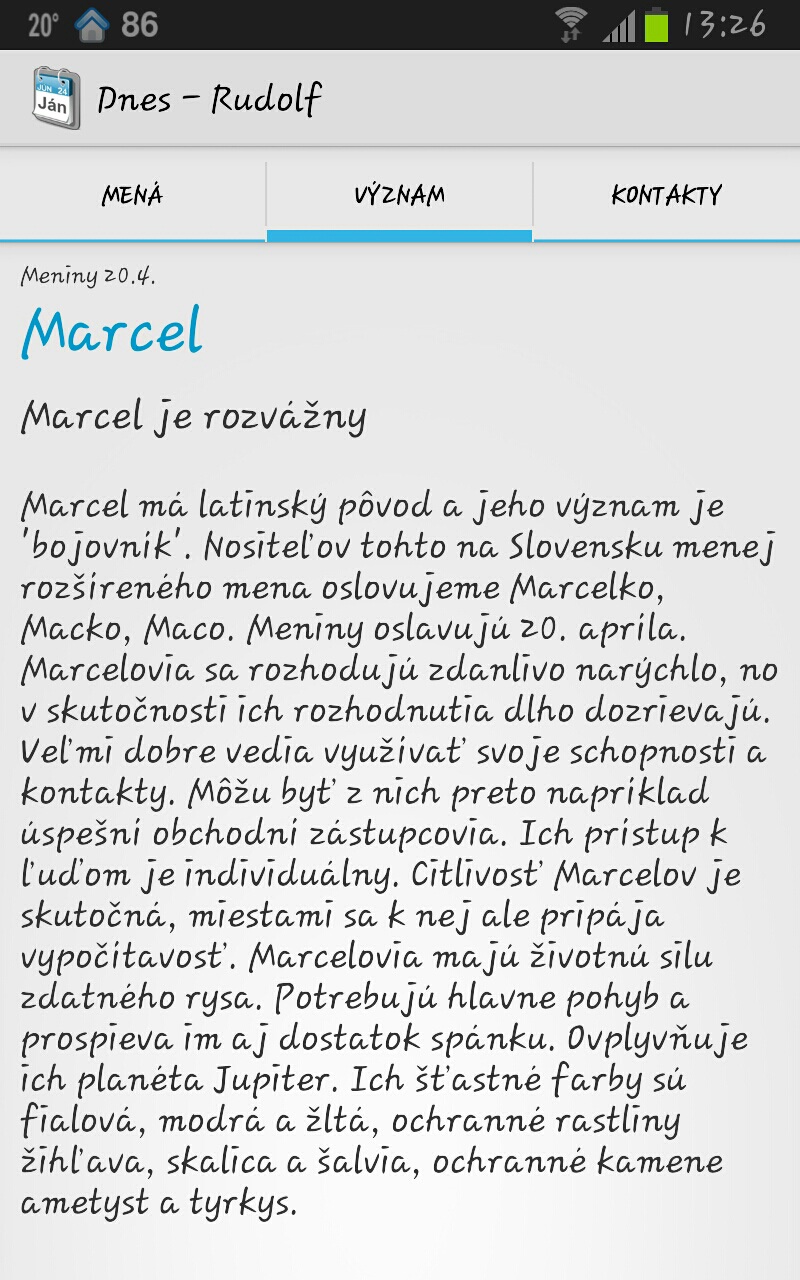 Ku každému menu (Pro verzia) tu nájdeme charakteristiku, ktorá obsahuje pôvod mena, typické vlastnosti, povahové črty, ochranné rastliny, farby a drahokamy. Bezplatná verzia má na ukážku charakteristiku a význam iba u mien v 10. a 20. dni v mesiaci.