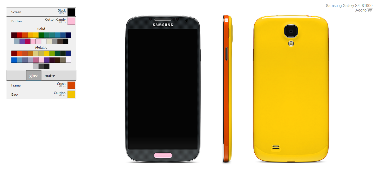 V prípade Samsungu Galaxy S4 si môžete prispôsobiť farbu prednej steny, Home tlačidla, bočných hrán a zadného krytu. ColorWare štúdio ponúka celkovo 46 rôznych farieb. Po ich zvolení sa môže začať proces premeny. Váš telefón rozoberú, očistia, nalakujú a následne skontrolujú. Na konci tohto postupu mobil zabalia do originálneho obalu a ten putuje k svojmu majiteľovi. ColorWare ponúka medzinárodnú odblokovanú verziu Samsungu Galaxy S4 a za takto upravený telefón si vypýta 1000 dolárov (dnes približne 750 eur). Medzi podporovanými krajinami nechýba ani Slovensko, doručenie trvá približne 14 dní.