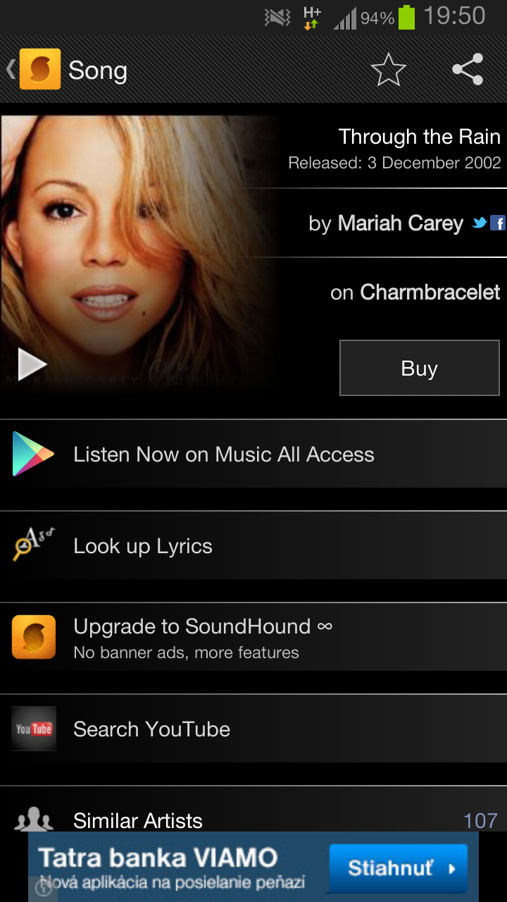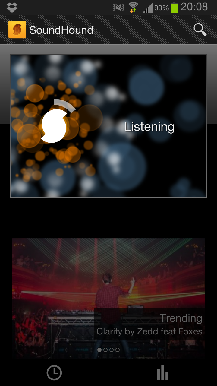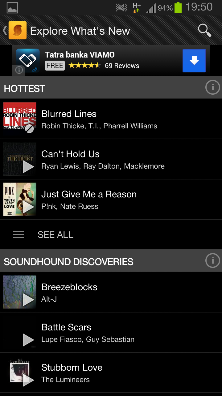 Ďalšou podobne zameranou aplikáciou je SoundHound. Výhodou je podstatne širšie použitie na viacerých platformách. Tešiť sa tak môžu majitelia zariadení s iOS, Android, Windows Phone alebo BlackBerry. Okrem počúvania spolu so smartfónom môžete skúsiť na rozpoznanie aj niečo zaspievať alebo zahmkať. Avšak ideálne je byť v čo najväčšom tichu a mať aspoň minimálnu predstavu o hudobnom sluchu. Rovnako si v rámci vyhľadaných informácií môžete prezerať aj rôzne rebríčky. Nechýba vyhľadávanie textov, odkazy na podobných umelcov alebo výskyt danej skladby v jednotlivých albumoch.
