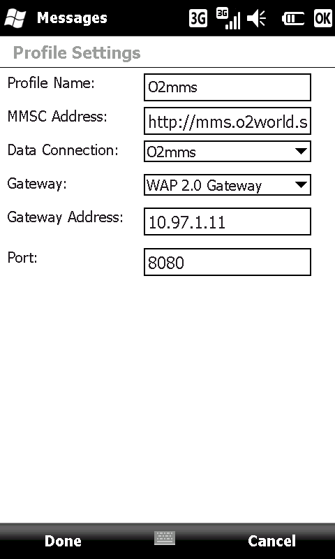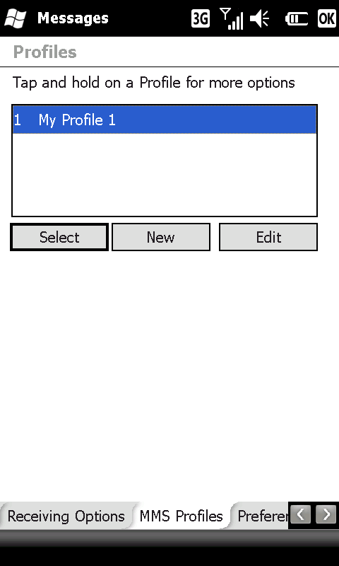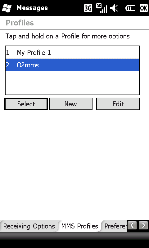 Vojdite naspäť do menu, zvoľte Správy, kliknite na Menu a Nastavenia MMS.V záložke Profily MMS kliknite na Nový a vyplňte ho podľa priložených obrázkov. Adresa MMSC predstavuje hodnotu http://mms.o2world.sk:8002. Po vytvorení profilu naň ťuknite a zvoľte tlačidlom Select. Opäť potvrďte OK.