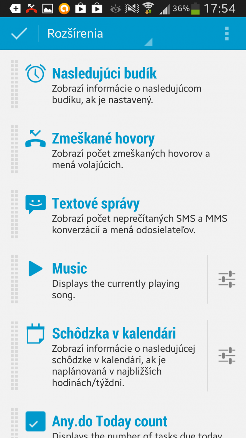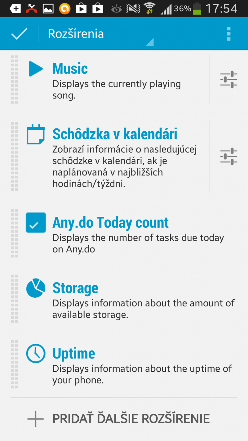 Z množstva rozšírení si vyberám počasie, zobrazenie počtu nových e-mailov, počítadlo dát, zmeškané hovory, využitie ukladacieho priestoru, zobrazenie nových správ na WhatsApp, prehrávač hudby a údaj o poslednom reštartovaní zariadenia. Rozmiestnenie rozšírení sa dá meniť a notifikácie si viem do danej aplikácie priamo pridať.