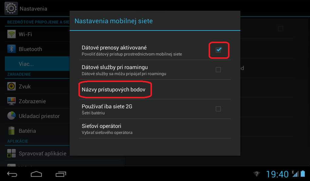 Už štandardne si ako prvé nájdeme Nastavenia. V hornej časti zobrazenej ľavej lišty vidíte nastavenie bezdrôtovej komunikácie. Aby ste si odkryli ďalšie položky, kliknite na Viac. Nezabudnite, že pre fungovanie dát musíte mať zaškrtnutú položku Dátové prenosy aktivované. Pre samotné nastavenie kliknite na Názvy prístupových bodov.
