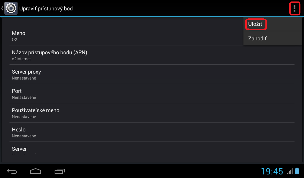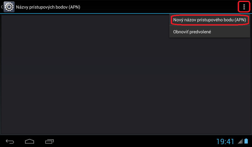 Dostali ste sa do zoznamu vytvorených dátových profilov. Štandardne by sa vám tu mal zobraziť profil pre internet, v prípade podpory tabletu aj MMS. Ak sa tak nestalo, tak kliknite na pravý horný roh a Nový názov prístupového bodu. Nastavenie vyplníte podľa priloženého obrázku.