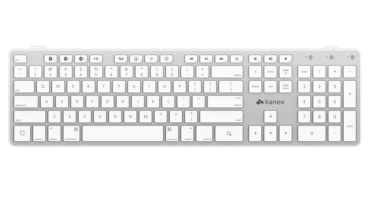 V prípade Kanex Multi-Sync Keyboard sú tlačidlá na prepínanie zariadení samostatné, umiestnené vedľa kláves pre ovládanie hlasitosti, multimédií a jasu. Nechýba tu ani tradičný numerický blok. Treba však počítať s tým, že hoci bude klávesnica použiteľná aj spolu s Windows či Androidom, dolu nájdeme klávesy Command a Home Button typické pre Apple. Tlačidlo vyhľadávania funguje iba s iOS 6 a nižším.