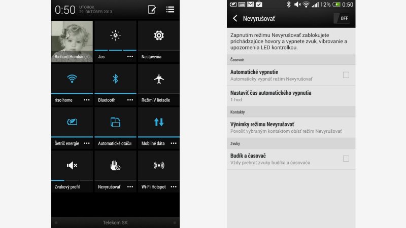 Prekvapenie čaká i vo výsuvnej lište. Poradie skratiek rýchlych nastavení sa dá upravovať, objavil sa aj nový časovaný tichý režim Nerušiť s možnosťou udeliť výnimku vybraným kontaktom a budíkom.