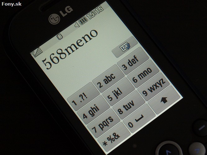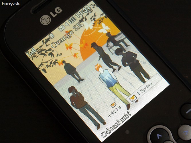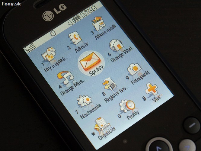 sa obraz na displeji do dvoch sekúnd otočí. Klávesnica je dobrá, zvykol som si na ňu, a ak nebude slúžiť na hodiny písania cez ICQ, poteší vás svojimi možnosťami. Mimochodom, nájsť ICQ Java aplikáciu s otočením displeja nie je podľa témy LG KS360 v našom diskusnom fóre také jednoduché. LG KS360 je tínedžerský telefón, a pre písanie SMS, krátkych e-mailov a Bluetooth správ je táto klávesnica primeraná. Písanie znakov s diakritikou je však veľmi nepohodlné. Ak chcete výnimočne zadať "č", musíte použiť tlačidlo Sym, ktoré zobrazí ponuku rôznych znakov a preklikať sa až k hľadanému "č" (siedma strana šestnásťstranovej ponuky). Tlačidlo Fn použijete pre zadávanie sekundárnych znakov, a dá sa aj zamknúť. Rovnako funguje aj tlačidlo Shift. Do horných rohov klávesnice umiestnil výrobca výberové tlačidlá, ako šípky slúžia tlačidlá O, K, L M. je vydarený, ponúka pár zaujímavostí. Na domácej obrazovke Live square vidíte niekoľko postáv. Tie charakterizujú zmeškané udalosti. Jedna osoba je boris, ktorý mi včera písal správu, druhou je tomáš, ktorý pred chvíľou volal. Veľký zmysel tejto tapete nedávam, ale niekto jej možno na chuť príde. Radšej som si nastavil tapetu podľa témy, ktorá zobrazuje aj ikony funkcií priradených štyrom šípkam. Šípka doľava otvorí obľúbené položky, teda funkciu zhodnú napríkad s "Ísť na" v Nokiách. Vaše obľúbené funkcie si zvolíte sami. je ikonové, 3 x 4, po vysunutí klávesnice 4 x 3. Na ležato je usporiadanie iné...teda, spodný riadok sa presunul doprava. K dispozícii je oranžová a čierna téma...ja som radšej používal menej peknú, ale prehľadnejšiu, oranžovú. Nechýba nastavenie doby a intenzity podsvietenia.Funkčná výbava tohto päťtisícového prístroja je až prekvapivo dobrá. Slúchadlá sú priemernej kvality, chýba im najmä reprodukcia hĺbok. Určite oceníte vysokú hlasitosť slúchadiel aj telefónu. Ani hlasná reprodukcia nie je najkvalitnejšia, no buďme ku lacnému telefónu zhovievaví. FM rádio ponúka automatické ukladanie staníc, ale každú musíte uložiť. Možnosti FM rádia sú slabé, ponúka vlastne len hlasnú reprodukciu. FM rádio nemôže hrať na pozadí. Prehrávač hudby zato minimalizovaný byť môže, a ponúka tiež pestrý ekvalizér. Škoda absencie 3,5 mm jacku, aspoň na adaptéri.