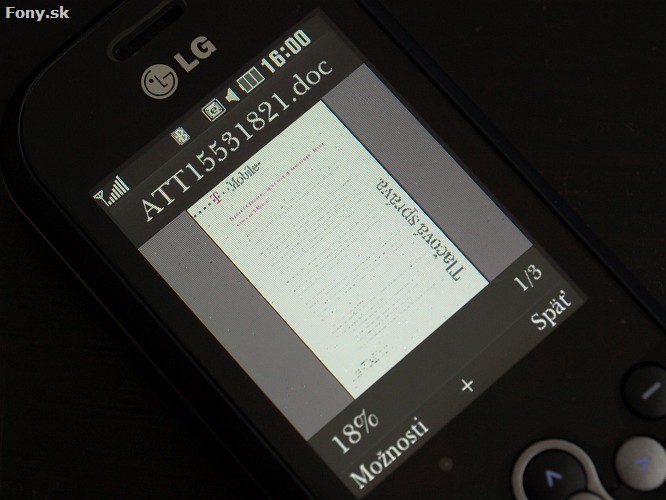 otvára DOC, XLS, PDF, PPT a RTF súbory v e-mailoch alebo zo zložky dokumenty. Jedná sa však o prezeranie snímok dokumentov (predstavte si, že dokument odfotíte a prezeráte i približujete len jeho fotografiu), na zalamovanie riadkov zabudnite. Podobne je tomu aj v ostatných telefónoch LG aj Samsung. Problém prehliadača dokumentov je, že ich nedokáže otvárať z pamäťovej karty ani iného priečinka, než Dokumenty. Keď som dal vybrané dokumenty (rôznych typov) skopírovať do pamäte telefónu, boli skopírované do priečinka Iné a priečinok Dokumenty ostal prázdny. Presun medzi priečinkami možnosti telefónu neponúkajú.Výdrž prístroja na jedno nabitie je zrejmá aj z 800 mAh batérie - dva až tri dni bežného používania.