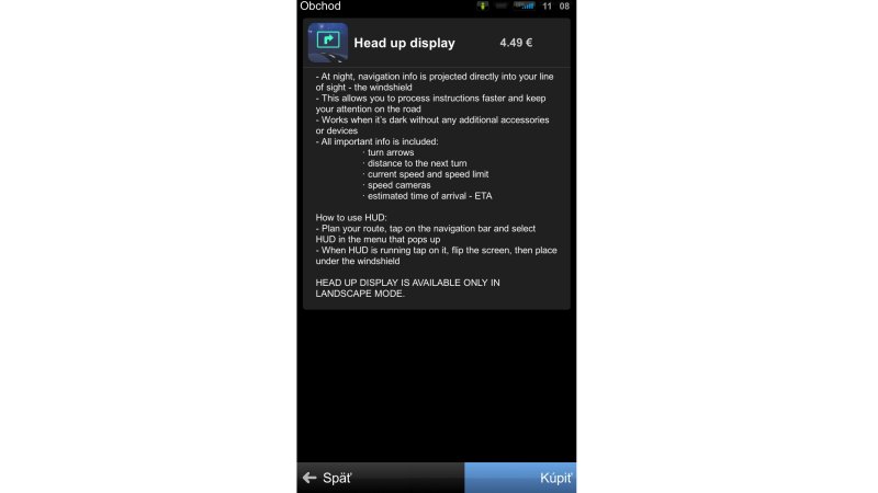 Takéto zobrazovanie informácií na čelnom skle bude pochopiteľne spoľahlivo fungovať hlavne v noci. Voľne položené predmety v kabíne vozidla navyše môžu byť nebezpečné a odporúčame použiť aspoň protišmykovú podložku. Head-up displej nie je v novom Sygicu dostupný v základe, funkciu si musíte dokúpiť za 4,49 € priamo z aplikácie v sekcii Môj Sygic.
