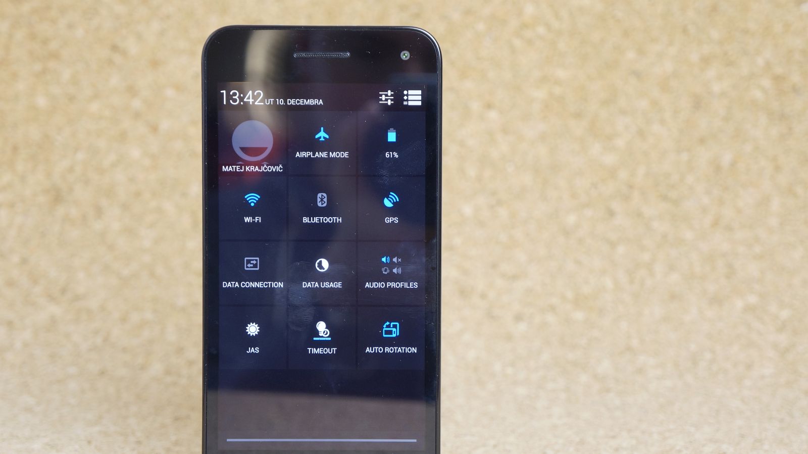 Nechýba tu ani merač prenesených dát, s možnosťou automatického resetovania na začiatku zúčtovacieho obdobia. A ešte jedna výborná funkcia - automatické vypnutie a zapnutie telefónu, s detailným nastavením a checkboxami pre každý deň v týždni. V pondelok až v piatok sa teda telefón môže sám zapnuť napríklad o 6:30 ráno (v tom prípade vás zobudí aj nastavený budík), v sobotu a v nedeľu sa naopak môže automaticky vypnúť už o deviatej večer. Zamrzí iba to, že autorom bola pri doplnkových funkciách a položkách úplne ukradnutá nutnosť jazykovej lokalizácie. V menu nastavení by sa ešte zopár anglických položiek medzi slovenčinou dalo prehliadnuť, po stiahnutí notifikačnej lišty a prechode k rýchlym nastaveniam sa však pozeráte na "AIRPLANE MODE", "DATA CONNECTION" či "AUTO ROTATION". Slovenský "JAS" bije do očí a prehráva 11 : 1. Telefón bol samozrejme nastavený do nášho materinského jazyka.