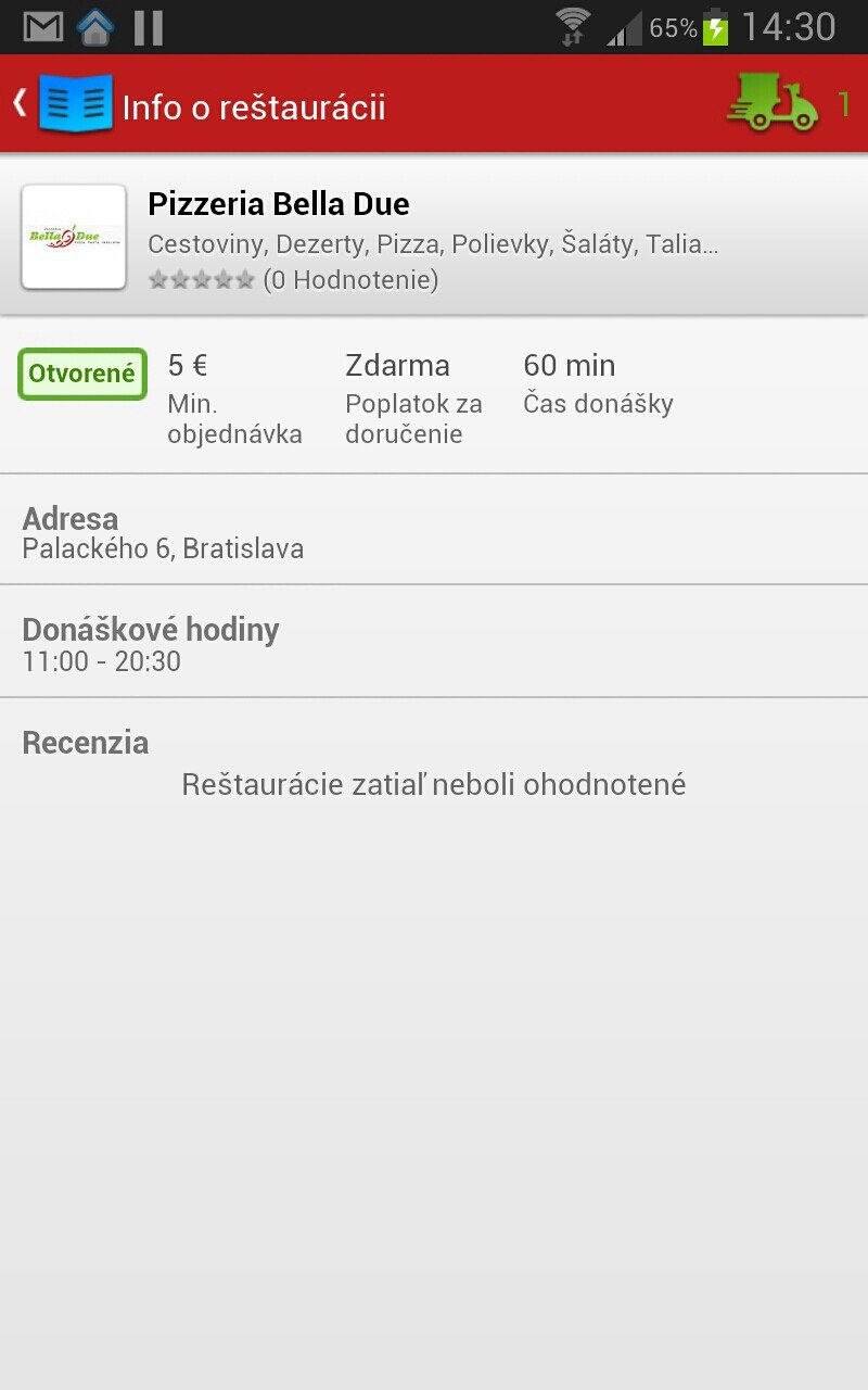 Pri každej reštaurácii nechýbajú dôležité informácie: adresa, telefónne číslo, poplatok za doručenie, čas rozvozu ani minimálna hodnota objednávky. V aplikácii nájdete aj históriu vašich objednávok.