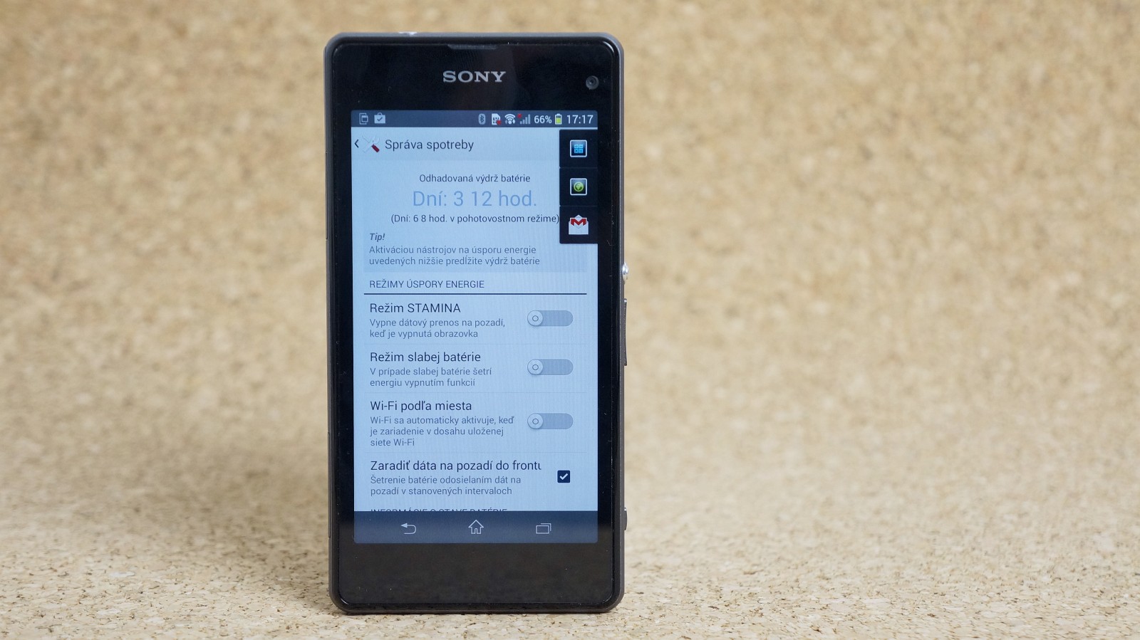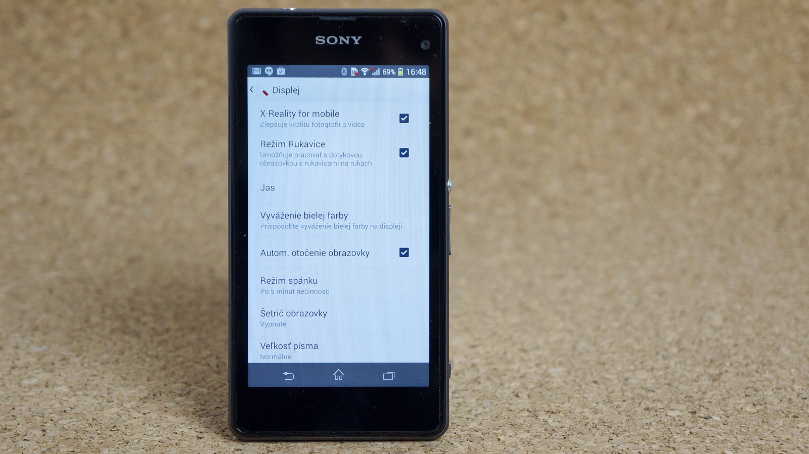 Po nie najvydarenejšom displeji na Xperii Z sa Sony poučilo a už v nasledujúcej Xperii Z1 sme sa dočkali výrazného zlepšenia. Rovnako kvalitný displej ponúkne aj kompaktná verzia. Farby sú konečne živé, pozorovacie uhly výrazne lepšie (aj keď nie najlepšie) a čitateľnosť na slnku slušná. HD rozlíšenie je na 4,3-palcovej uhlopriečke viac než dostačujúce. S podobným rozlíšením sa stretneme aj na 4-palcových smartfónoch spoločnosti Apple. Full HD by tu nemalo veľký význam. Možno akurát tak marketingový. Zobrazenie je jemné, články v prehliadači som približoval minimálne. V nastaveniach displeja si môžete aktivovať režim Rukavice, ktorý zvýši citlivosť dotykovej plochy. Ako už názov prezrádza, túto funkciu využijete najmä pri ovládaní v rukaviciach. Bez rukavíc je možné displej ovládať aj pár milimetrov nad dotykovou plochou. Vtedy sa na obrazovke zobrazí veľký okrúhly kurzor.