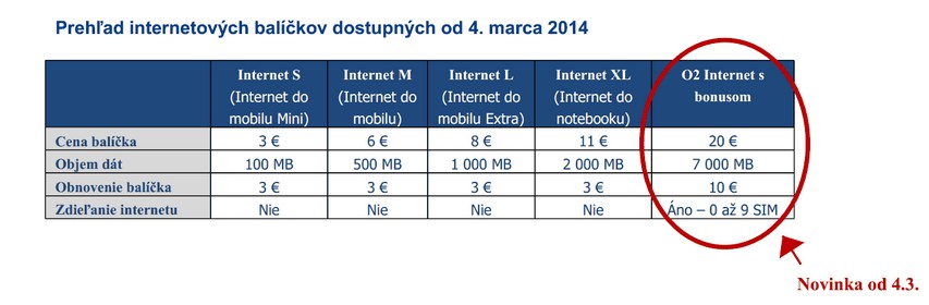 Od zajtra (4. marca 2014) si môžu všetci noví aj existujúci zákazníci O2 aktivovať nový program O2 Internet s bonusom. Ten zahŕňa 7 GB predplatených dát za 20 € s možnosťou zdieľania na viacerých SIM kartách. Zároveň môžu získať bonus vo výške 198 € na kúpu tabletu so službou O2 Mobil+.