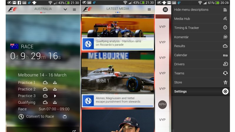 Používateľa privíta trojica základných kariet. Race Centre ukáže zostávajúci čas do štartu najbližších pretekov vrátane nevyhnutných informácií o okruhu alebo predpokladanom počasí na ňom, Media Centre zas výber posledných správ z oficiálneho webu F1.com. Posledná karta robí prakticky to isté, ibaže správy filtruje len na tie, ktoré sa týkajú jedného z 22 jazdcov, ktorého označíte ako svojho obľúbeného.